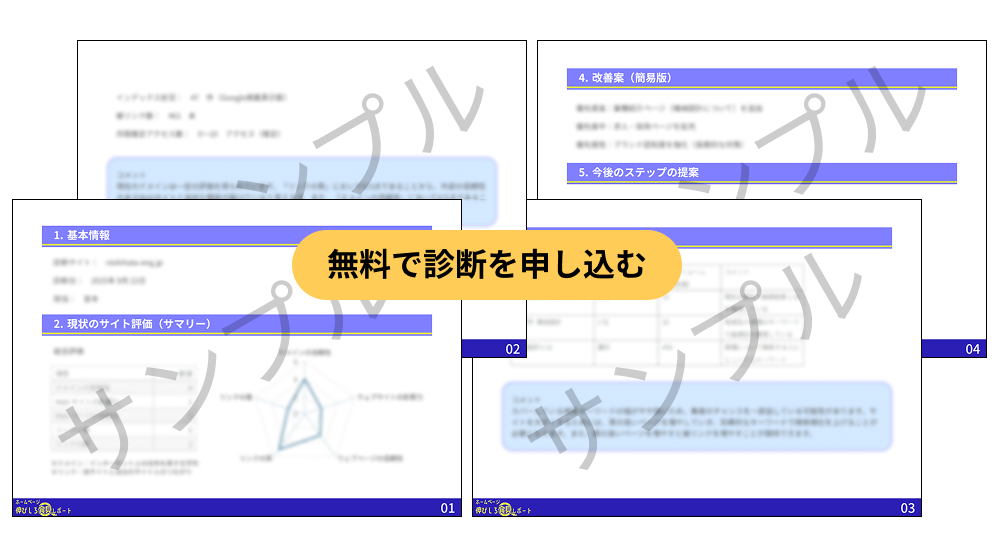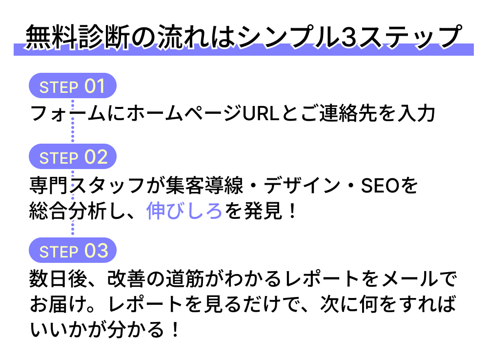 見逃している集客チャンスを、無料で診断 “今のまま”を変える、集客のヒントを3日以内にお届けします。 ホームページを診てもらう→ インサイト 制作会社まかせのサイト運用が失敗する理由 中小企業こそ必要な「ホームページの定期点検」 初心者でもできるホームページでの集客術 ホームページ改善の第一歩は“現状を知ること”から デザインよりも大事?ホームページが伸びない“意外な理由”とは Googleに評価されるホームページの条件2025年版